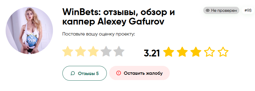 Про WinBets и лично про Alexey Gafurov в отзывах писали плохо. Люди жаловались, что каппер не умеет делать нормальные прогнозы. Почти все, кто пробовал ставить по его советам, оставались в минусе. Многие заметили, что цель проекта — это не честная аналитика, а заработок на проигрышах через 1xbet.