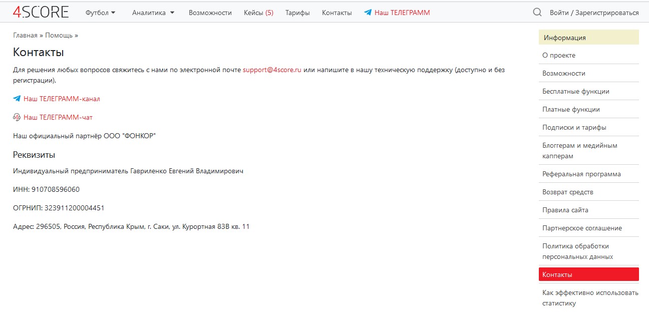 Среди плюсов 4score также можно отметить, что владельцы не скрывают свою личность и указали контакты. Не похоже, чтобы это был фейк.