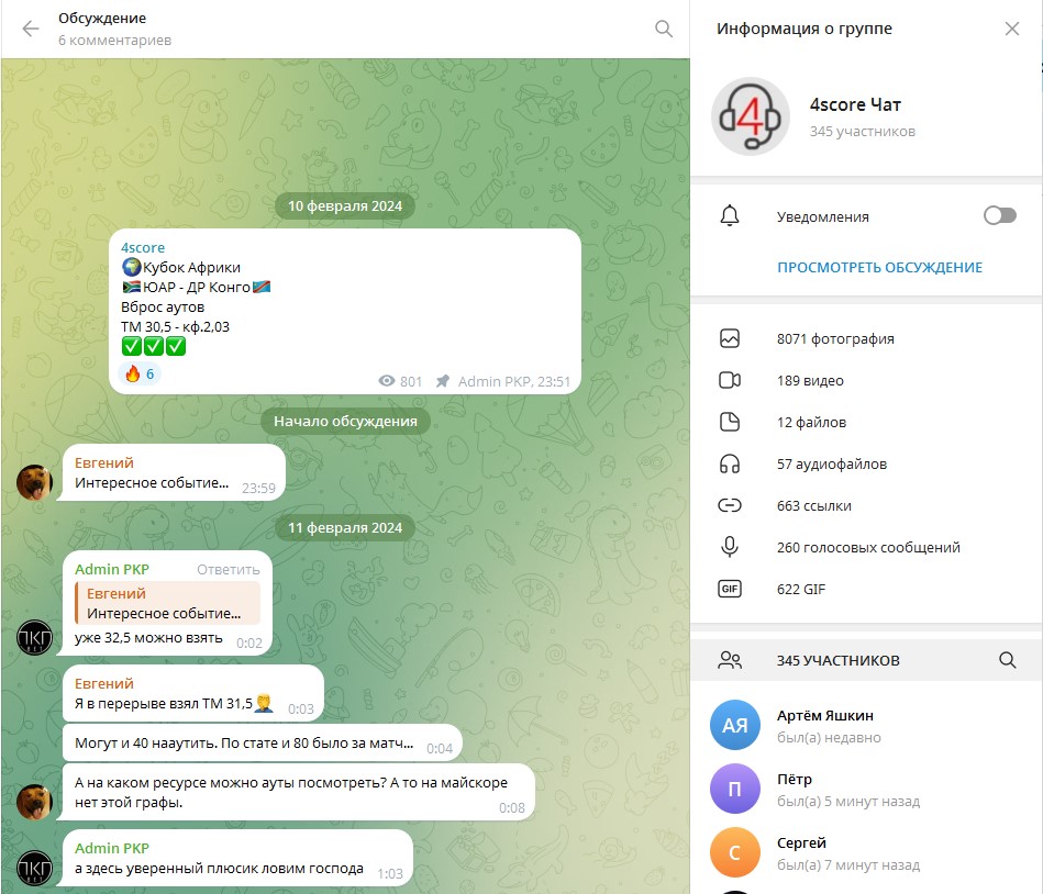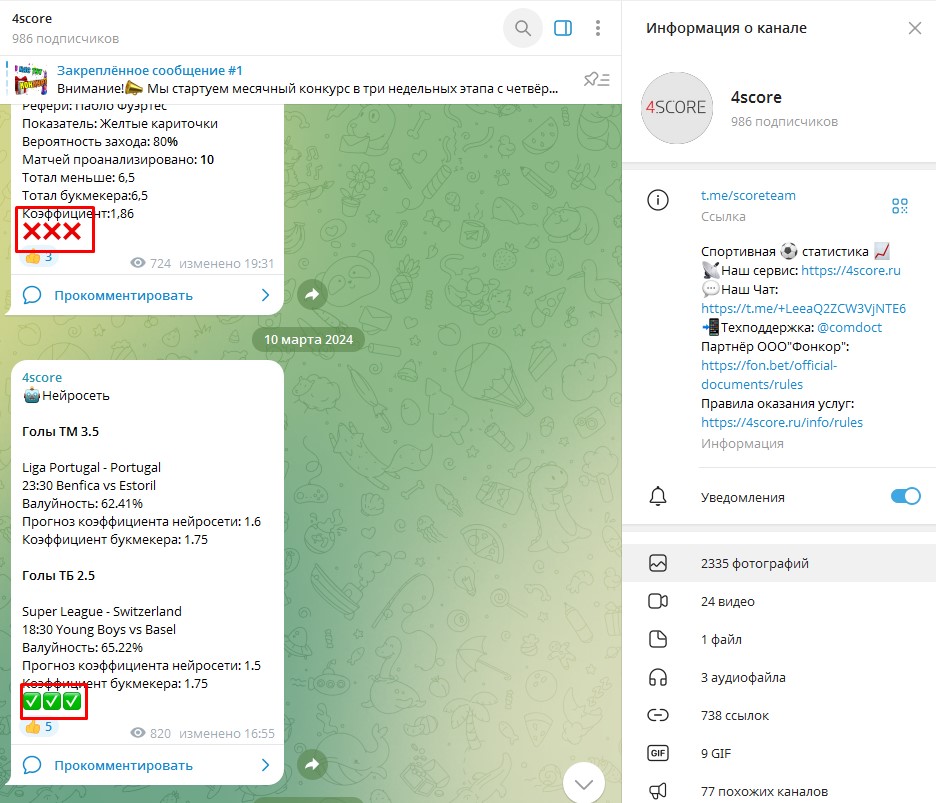 На канале проводятся конкурсы и публикуются бесплатные прогнозы, а также информация о 4score ru.
