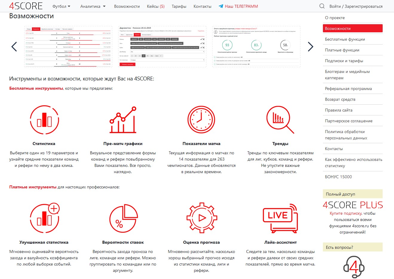 Сотрудничество с сервисом 4score можно оформить на сайте. Цена подписки составляет 1999 рублей на месяц. Клиент получает доступ к более точным инструментам для углубленного анализа и оценки прогноза.