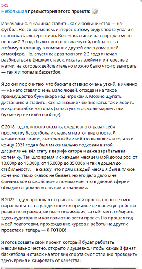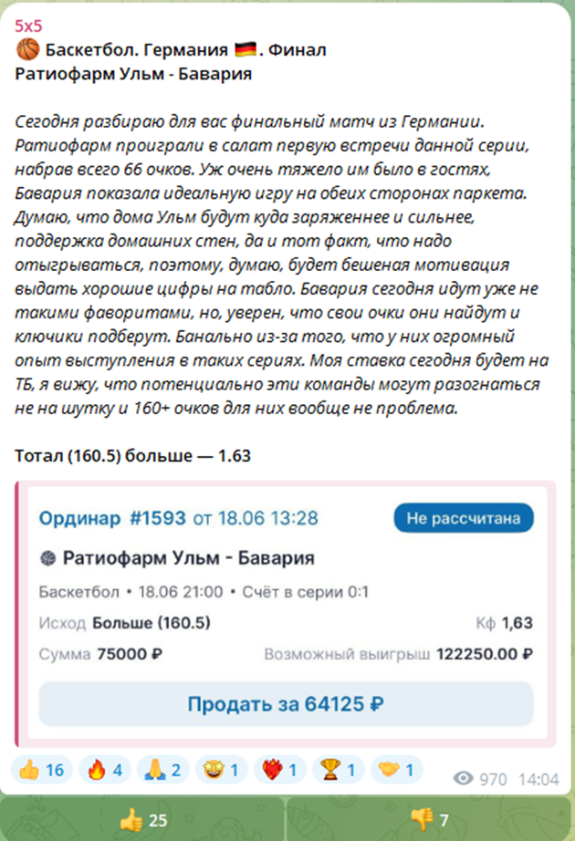 На телеграмм-канал «5x5» подписаны 8 150 пользователей, которые проявляют хорошую активность. Посты набирают от 1 000 просмотров, при этом комментировать записи в мессенджере аналитик не позволяет. Беттеры могут только ставить реакции на публикации.