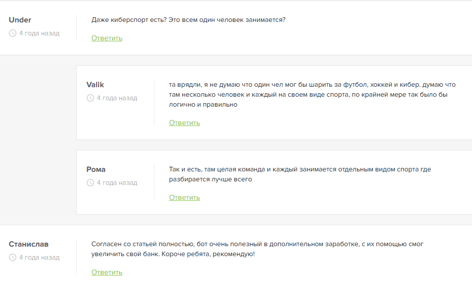 Не нашли ни одного негативного отклика, несколько человек написали, что им удалось увеличить банк, но большая часть беттеров просто обсуждали, как устроен бот, по какому принципу работали аналитики.