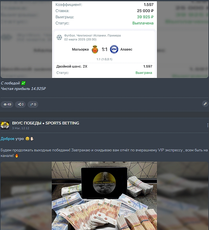 В телеграмм-канале ВКУС ПОБЕДЫ SPORTS BETTING он уже не делает рекламу типичных для обмана «договорных матчей» и нелегальных БК, а просто торгует прогнозами на случайные игры. «Аналитика» экс-владельца ALEX BETTING ограничена односложными фразами без конкретики, и подобное тот считает нормальным для требования у аудитории денег.