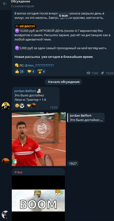 Притом платеж тот выставил всего за один день, и простые расчеты доказывают не то что убыточность, а опасность ставок с Алексеем Мельниковым в долгосроке. Уже через неделю @Alex_77777777777 опустошит ваш банк на 70000, раздавая платные замены из пакетов «лудоманских» прогнозов и обещая выход в плюс когда-нибудь потом.