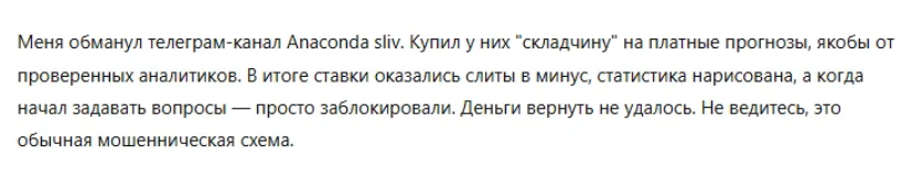 На Anaconda sliv поступают жалобы, игроки пишут о поддельной статистике, минусовых ставках, невозможности вернуть проигранные деньги. Админы не готовы отвечать на вопросы клиентов и блокируют их при первой же возможности.