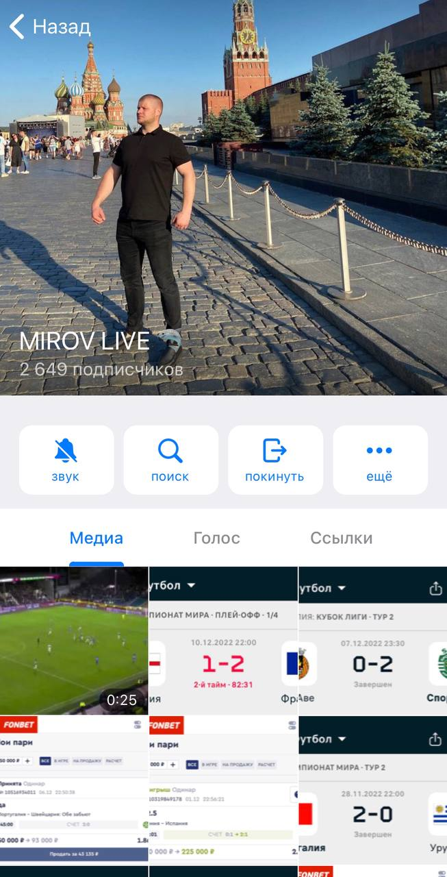 Андрей Миров – это автор Telegram-канала MIROV LIVE, который начал работу 10 сентября 2022 года. Проект специализируется на лайв-ставках в футболе, а также периодически публикует аналитику по теннису. Каппер работает с ординарами с коэффициентами от 1.5 до 3.0. В прогнозах затрагиваются стандартные рынки: тоталы, индивидуальные показатели, обе забьют, победы по сетам. Однако стабильность работы вызывает сомнения — автор часто уходит «на выходные», регулярность публикации прогнозов не соблюдается.