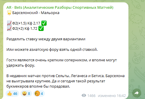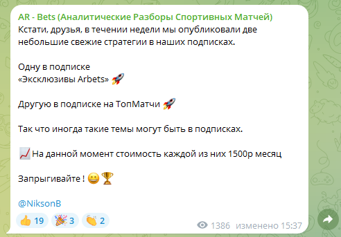 Автор канала NiksonB любит давать прогнозы на голы определенных игроков, а также на тоталы. В описании канала сказано, что с ним можно связаться по рекламе, однако сейчас в группе не часто выходят платные посты. AR Bets насчитывает почти 5000 подписчиков, а посты собирают примерно по 1500-2000 просмотров. Это адекватное соотношение, и нам не кажется, что большая часть подписок накручена.