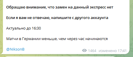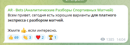 Важно отметить, что сейчас мы говорим о бесплатной аналитике, в то время как есть VIP-ставки. По утверждениям админов, на канале можно находить экспрессы с высокими коэффициентами за дополнительную плату.