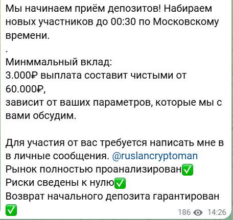 Все, что требовалось сделать – написать Руслану о желании работать и быть готовым вложить от 3 тыс. рублей. Реальные гарантии надежности отсутствовали, аналитик на словах обещал, что депозит будет отыгран, в схеме нет рисков.
