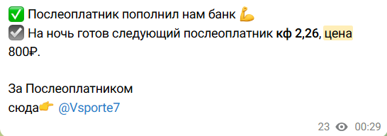 У прогнозиста нет ВИП чата, он специализируется на поштучных прогнозах, средняя цена – 800 рублей на послеоплату. С большей вероятностью игроки получают разные исходы на один матч, а в отчетности появляется та ставка, которая случайным образом принесла победу.
