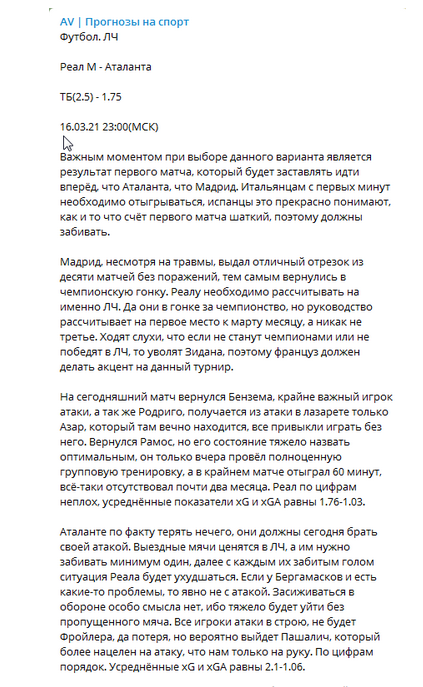 Деятельность телеграмм-канала AV Прогнозы на спорт