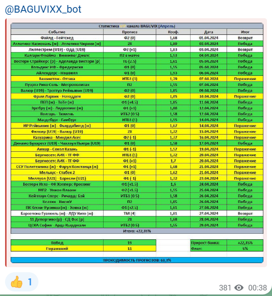 Админ выбирает события с коэффициентами до 2. Статистика в Telegram канале составляется вручную в табличной форме, процент проходимость – 60-65%. На практике такое количество выигрышей реально, но убедиться в подлинности отчетов можно только после верификации, которую аналитик не проводит.