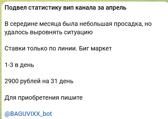 Капер Baguvixx bot ведет дополнительный канал с платным доступом. Цена за 1 месяц – 2,9 тыс. рублей, в подписку входит до 3 ставок по линии каждый день. Аналитик не предусмотрел вариант со сливом банка, не будет компенсировать убытки клиентов.