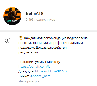 Bet БАТЯ — молодой телеграм-канал, запущенный в августе 2024 года, где прогнозист Andrei bets публикует спортивные прогнозы. Основной контент — ставки на спорт, включая хоккейные и футбольные матчи. Платформа — Telegram, где у канала около 5000 подписчиков. Комментарии пользователей отключены, что вызывает недоверие. Это похоже на попытку удалять негативные отзывы и жалобы. Негативные реакции тоже заблокированы, что ограничивает мнение аудитории.