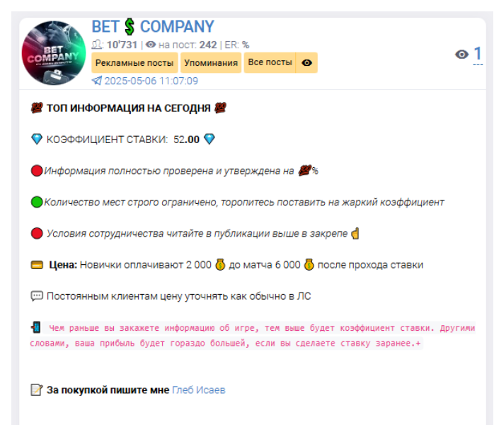 Bet Company – это закрытый телеграмм-канал по договорнякам, которым руководит аналитик Глеб Исаев с профилем Gleb Isaev Official. Всем фолловерам автор гарантирует прозрачное и честное сотрудничество, а также инсайды на спортивные события. Заявляет, что с инсайдерскими данными работает немного больше 6 лет.