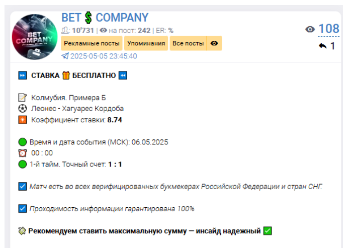 Мы изучили канал в Telegram Bet Company и можем ознакомить вас с нюансами его работы: