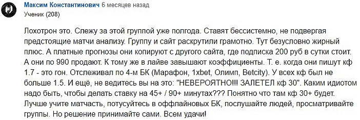 Что за бред платишь 20 штук за вип-подписку, а получаешь прогнозы будто их генератор случайных чисел накидал. Ни разборов, ни аналитики просто ставь. И как после этого не ржать с его экспертности? Чувак даже не парится, что его уже раскусили.