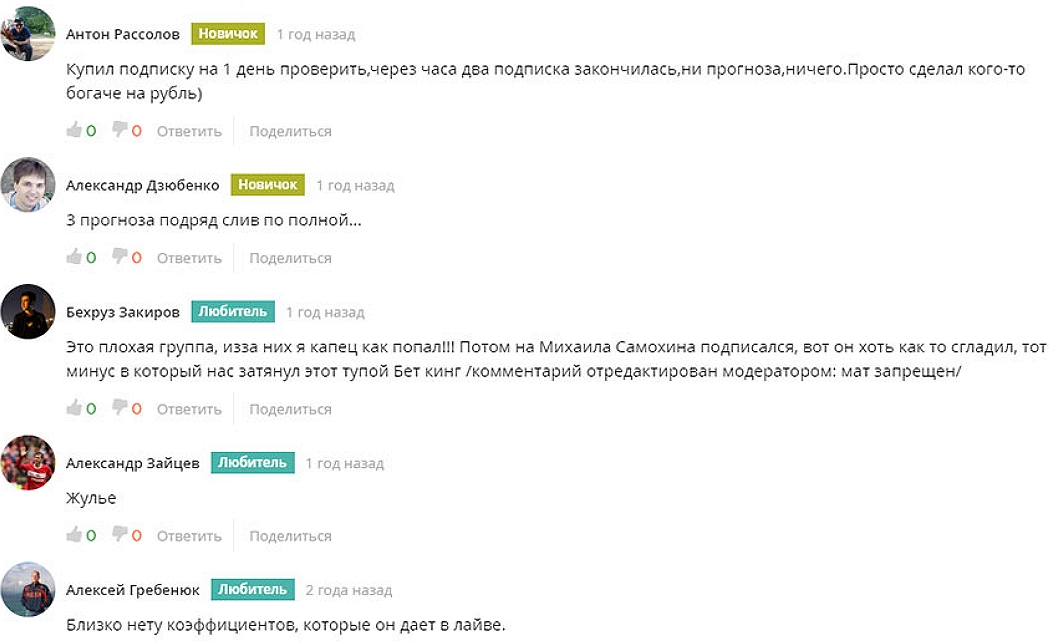 Также @korolbetking продавал «подписки» на прогнозы по small-маркетам за 20000 в месяц, то есть сотрудничество на таких условиях изначально было невыгодно для игрока, а легенда о «разделении прибыли» в пропорции 20:80 не в пользу капера типична для мошенничества. У себя на сайте Александр Викторович «наштамповал» кучу лестных отзывов на Betking Pro, только судя по жалобам с верификаторов даже разовый доход с горе-аналитиком исключен.