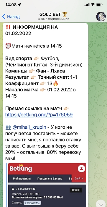 Договорными матчами Александр Король вроде бы не торгует, хотя и без них давно «наработал» на статью. Через телеграм-канал GOLD BET тот представлялся беттерам то Максом Кошелевым, то Максимом Савиным, то Михаилом с аккаунта @mihail_krupin, после чего зазывал к ставкам «под личным контролем» и сливал банк подчистую.