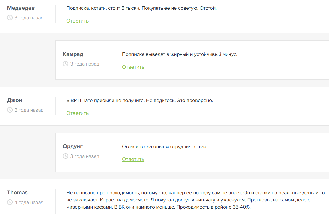 Капер закрыл комментарии к постам, поэтому игроки оставляют свои недовольства на сторонних площадках. У беттеров негативные впечатления от VIP – прогнозы вместо дохода приносят убытки, админ рисует статистику.
