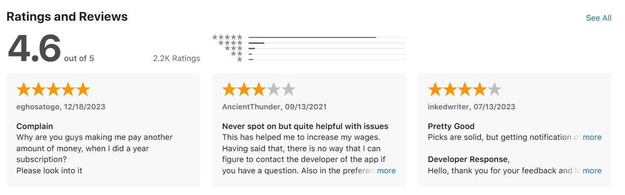 Отзывов на сторонних площадках мы не нашли. В Play Market и App Store содержатся только позитивные. В основном отзывы пишут англоязычные беттеры. Обвинений в мошенничестве мы не нашли. Программа официально размещена и предупреждает о платном контенте.