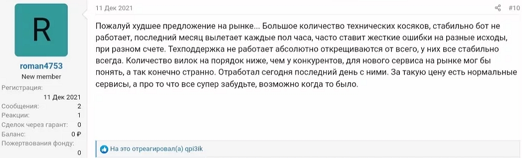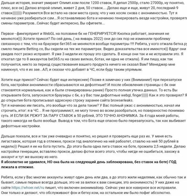 Отзывы о БеттингКо не отличаются позитивом, а покупатели ботов и сканеров еще в 2021 жаловались на проблемы с установкой анонимности и сопутствующую полную блокировку балансов в БК. Поддержке некогда решать их проблемы, хотя мы уже знаем — «бурная деятельность» в Betting Co. Chat срежиссирована мастерски.