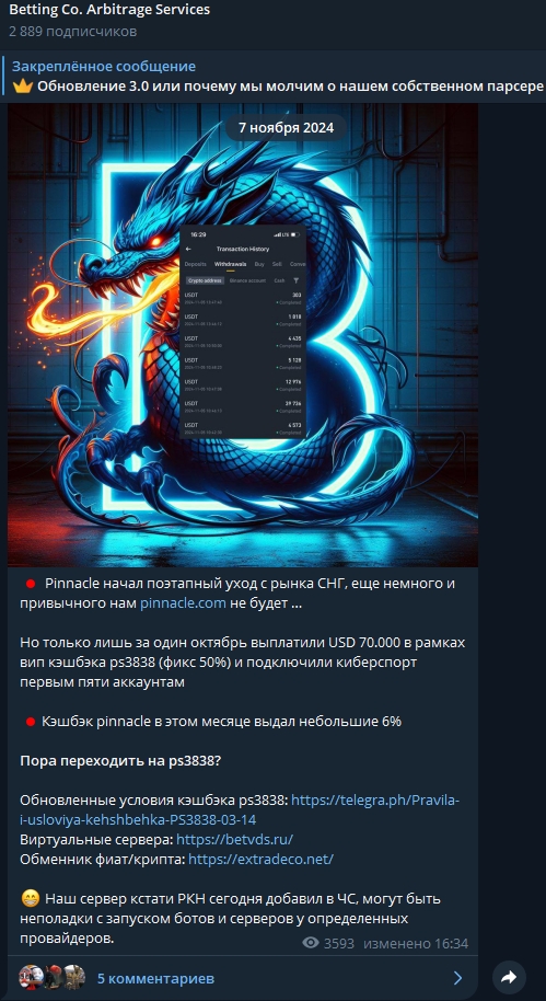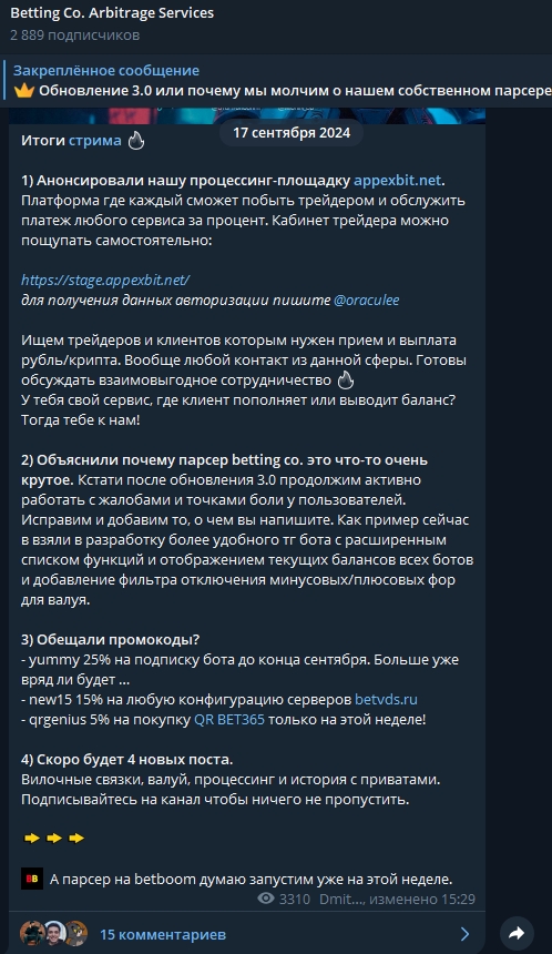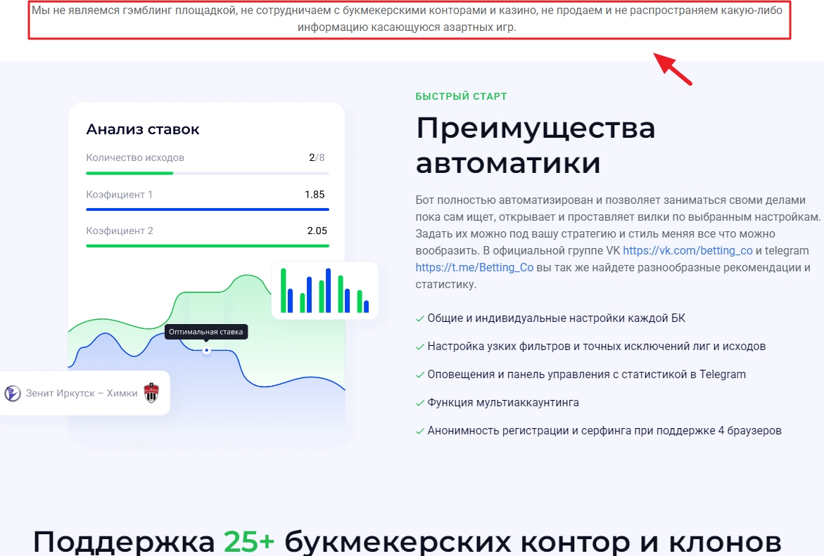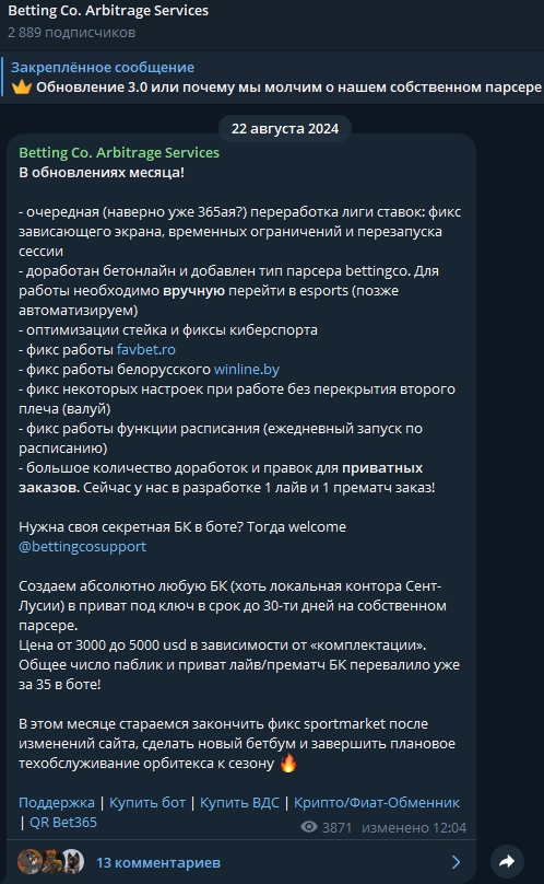 Удобно отказаться от ответственности и распространять сомнительное ПО, о реальной отдаче которого никто не знает. В Telegram Betting Co. Arbitrage Services все внимание уделено описанию бесконечных плюсов продуктов анонимов, но реально ли те настолько «крутые»?