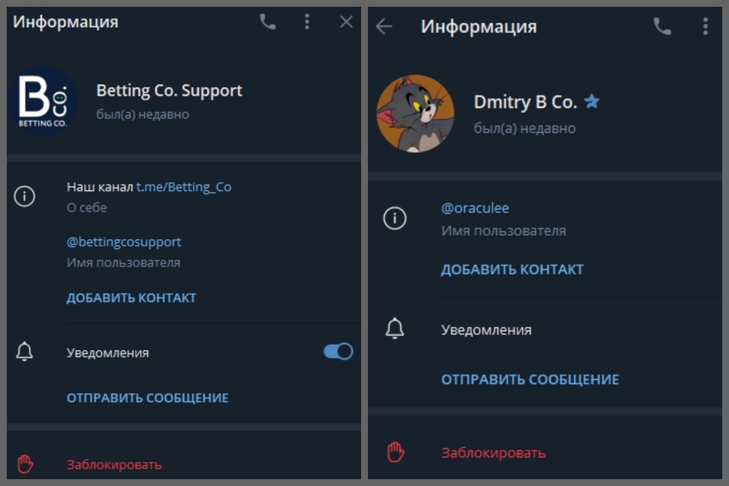 Это видно по скрину выше, и по факту анализ Bettingco можно заканчивать, если бы не навыки админов умело вводить в заблуждение. Так, игра на продвигаемых теми «вилках» может кончиться порезкой лимита и полной блокировкой счета в БК, но @oraculee и @bettingcosupport молчат об этом и выставляют себя «решалами» всех вопросов в телеграмм-канале Betting Co. Arbitrage Services.