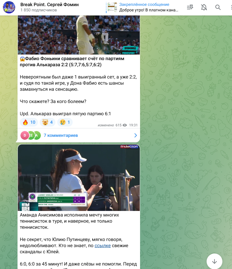 Плюсом является наличие аналитики к бесплатным прогнозам. Но она заканчивается на паре предложений, поэтому глубокий анализ тут искать не стоит. При этом по другим постам видно, что админ действительно следит за теннисом и разбирается в нем. Он сам смотрит матчи, постит кадры из них и часто комментирует происходящее в реальном времени, что является плюсом.