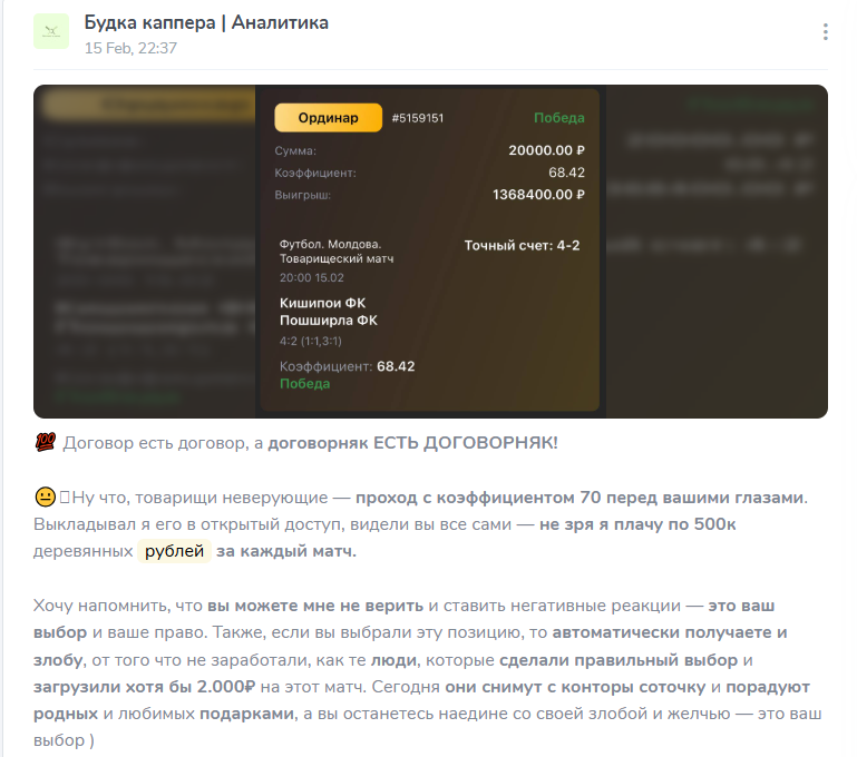 Аналитик не просто делится своими ставками на спорт, но и проводит обучение для желающих научиться точно прогнозировать и зарабатывать. Если учесть, что репутация у админа неоднозначная, прислушиваться к советам не стоит.