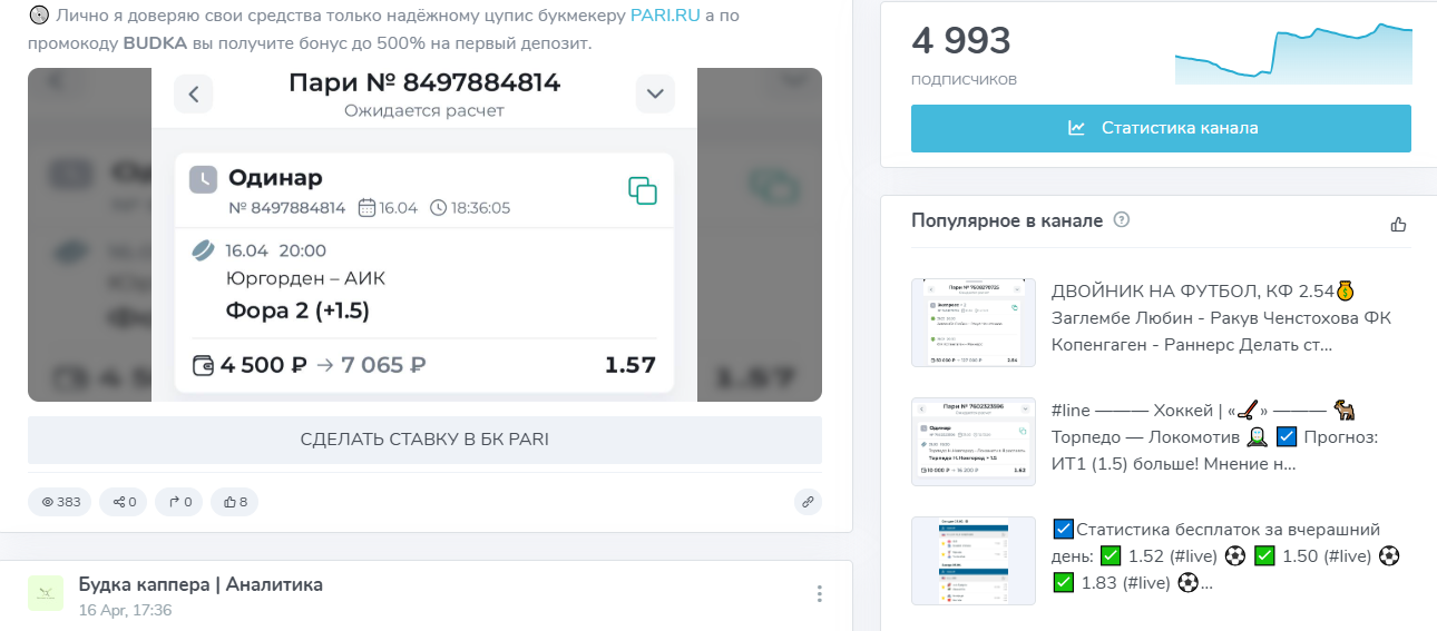 В ленте большое количество рекламы букмекерских контор. Прогнозист участвует в реферальной программе и получает доход, когда по его ссылке и промокоду в БК приходят новые клиенты. Проценты начисляются именно с проигрышей беттеров, поэтому админ заинтересован в сливе банка пользователей, а не помощи им.