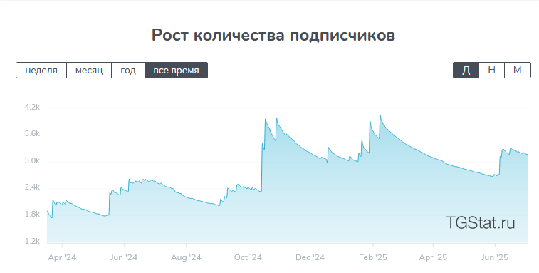 Автор канала неоднократно прибегал к накрутке подписчиков, обратите внимание на вертикальный отрезок графика в октябре 2024 года.