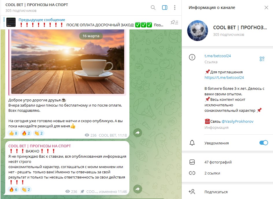 Главный прогнозист и создатель cool bet – некий Василий Прохоров @VasilyProkhorov. В профиле нет фото и какой-либо достоверной информации об этом человеке. О себе автор говорит, что его опыт в беттинге более 3 лет и весь контент на канале носит исключительно ознакомительный характер без гарантий.