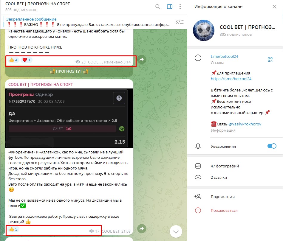 Деятельность телеграмм канала COOL BET | ПРОГНОЗЫ НА СПОРТ