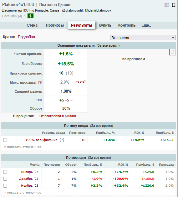 Статистику своих прогнозов Даниил Платонов потверждал на верификаторе bet-hub.com, но недолго — набралось всего 10 прогнозов. Прибыль составила +1.5%.