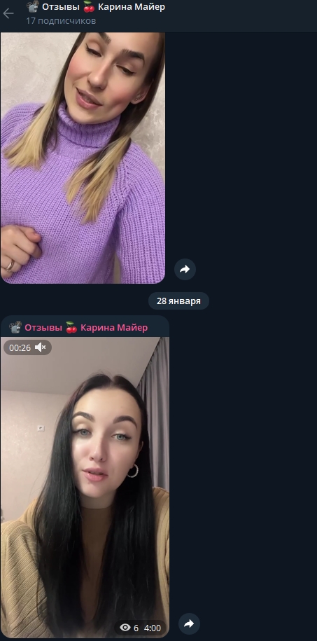 К слову, приписки о чем-то «официальном» типичны для проектов с «раскруткой», а результат сотрудничества с предлагающими ее лицами с гарантией будет негативным. Непременный «атрибут» таких начинаний найден на адресе @review_karina_mayer, и это открытый канал «Отзывы Карина Майер» при невозможности отыскать действующую ссылку на базовый ресурс.
