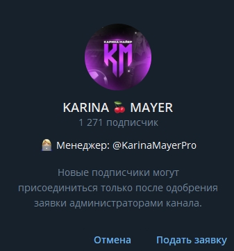 @KarinaMayerPro — админ телеграм-канала KARINA MAYER Cherry Bet, данные по которому противоречивы. На верификаторах найдены сведения о том, что он удален из мессенджера, хотя по косвенным признакам развод пользователей может продолжаться и сейчас.
