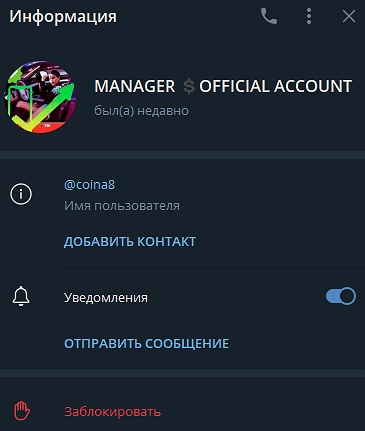 Проверка лжекапперши привела к ряду ресурсов явно мошеннической направленности, среди которых «Официальный канал» некой @coina8 — очередного «эксперта» в умножении банка, всегда готового кинуть зазевавшихся клиентов с профиля MANAGER OFFICIAL ACCOUNT. Сомнений в этом нет, что подтверждает приведенный ранее отзыв на Dark Money, а также разоблачения KARINA LIVE, KARINA BETWIN, KARINA ELUNISITA и массы клонов.