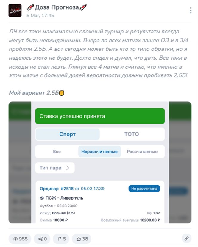 Деятельность телеграмм-канала «Доза Прогноза», реальная проходимость ставок @Dozabetmi