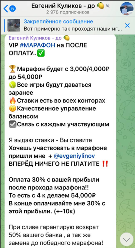 За участие в марафоне заранее платить не нужно, каппер потребует 30 процентов от прибыли только в случае удачного увеличения депозита. Однако на самом деле автор пытается заработать на реферальной программе букмекера. Он рекламирует контору в надежде получить часть от проигранных пользователями денег.