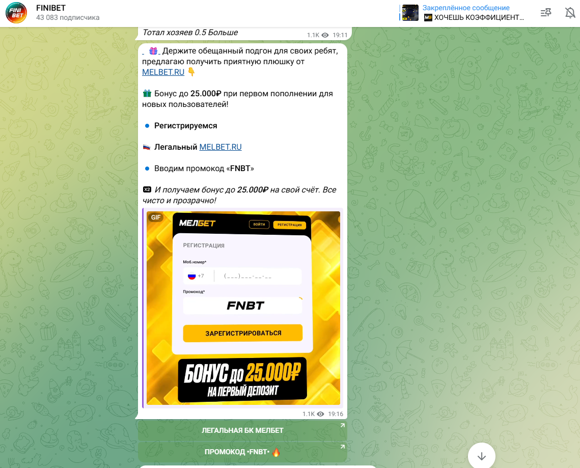 Также важно отметить, что Даниил Шумаков из FINIBET занимается агрессивной рекламой одной конкретной букмекерской конторы. Каждый предикт сопровождается ссылкой на нее. Выходят отдельные рекламные посты, а также публикации, в которых капер разбирается, почему его партнерская БК самая лучшая. Дело в том, что прогнозист получает деньги за каждую слитую подписчиками, перешедшими по ссылке, ставку. Именно поэтому ему важно агитировать всех регистрироваться по его ссылке. Так он повышает собственный доход.