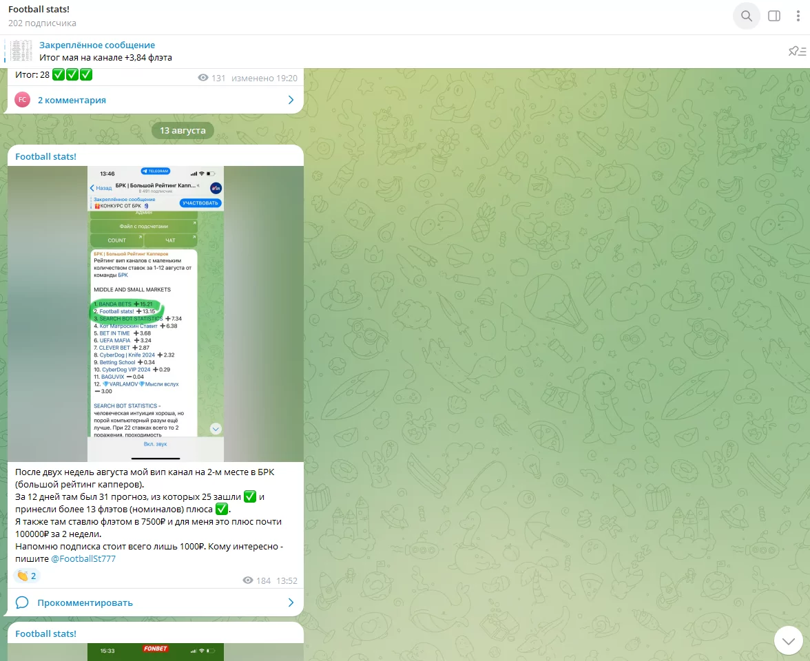Лучше бы я не приобретал подписку и в целом не связывался с пабликом football stats, это обычный недокапперский проект, который не умеет нормально ставить. Я прогорел на 15 тысяч рублей на 4х ставках, которые были получены в вип-чате. Принцип паблика понятен: заманить, а потом просто забить