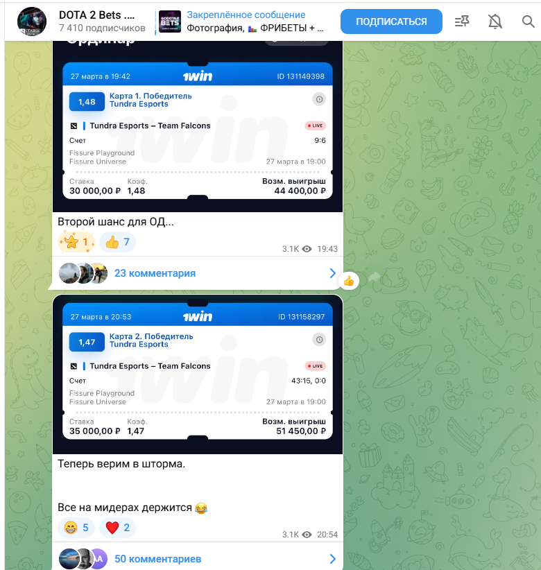 Плюсом проекта GoDota2Bets является его аудитория в 7 тысяч человек. Половина беттеров регулярно смотрит посты, что исключает подозрения в накрутке. Кроме того, в канале открыты комментарии, которыми люди активно пользуются. Отметим, что среди них есть, как негативные, так и положительные сообщения.