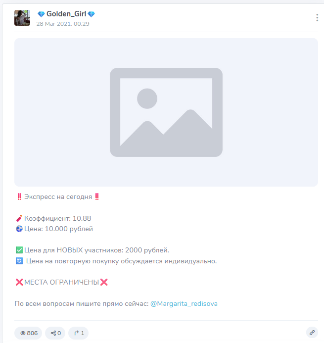 Сейчас канал Golden Girl неактивен, но раньше на него было подписано 21 тысяча человек. Только посты смотрело не больше 100. Это еще один признак мошенника – накрутка подписчиков. Ежедневно капер публиковал предложения купить экспрессы за 10 тысяч рублей, показывая собственные выигрыши по миллиону. Естественно, статистика не верифицирована и не доказана никаким другим способом.