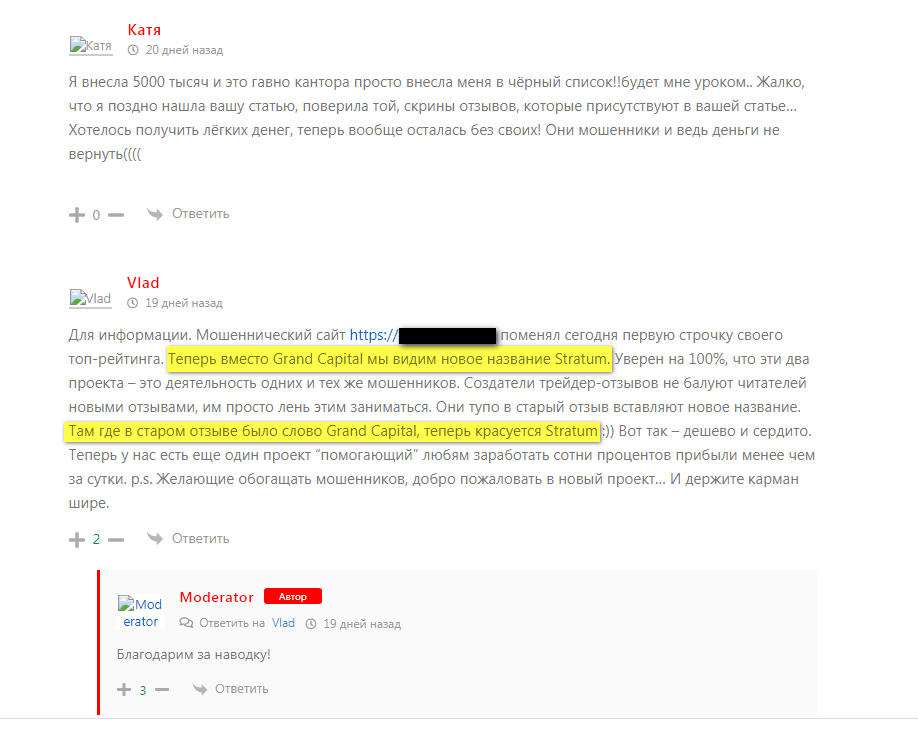 Большинство отзывов о Telegram-боте Grand Capital негативные. Пострадавшие указывают, что были обмануты после перевода денег на указанные реквизиты. В случае появления разоблачений, название проекта просто заменяется — так произошло с переходом от Grand Capital к Stratum. Содержание и структура «нового» проекта остались без изменений, что дополнительно подтверждает связь между ними.