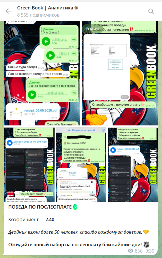 Грин Бук – один из телеграмм-каналов со сделками на разные спортивные события. Занимается им анонимный капер, который утверждает, что его паблик несет исключительно ознакомительный характер. Клиентам пытается донести, что ставки – это большой риск. Раскрутку и прочий мусор не предлагает, первый бетторам никогда не пишет. Всем, кто закажет у него услуги, гарантирует большие выигрыши.
