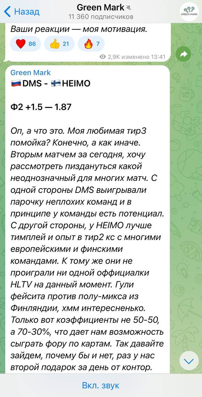 Телеграм-канал Green Mark специализируется на предсказаниях результатов матчей по киберспорту и футболу, однако надежность проекта вызывает сомнения. Один прогнозист вряд ли способен качественно анализировать разные виды спорта. Это наводит на мысли о возможном разводе или мошенничестве.