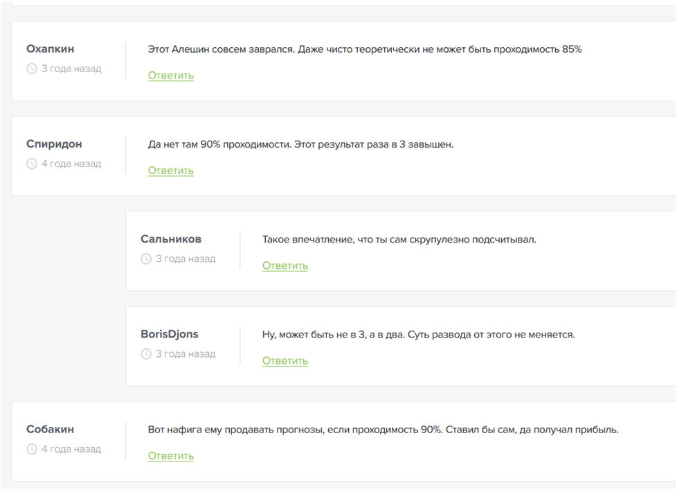 Алешин, какие 87%? Ты мне ими мозг вынес, пока я каждый день смотрел, как мои деньги тают. Покупал прогноз получал слив, спрашивал в личку вообще мороз! Аудитория фейк, реакции отключены, статистики нет. Один в один развод, как по учебнику.