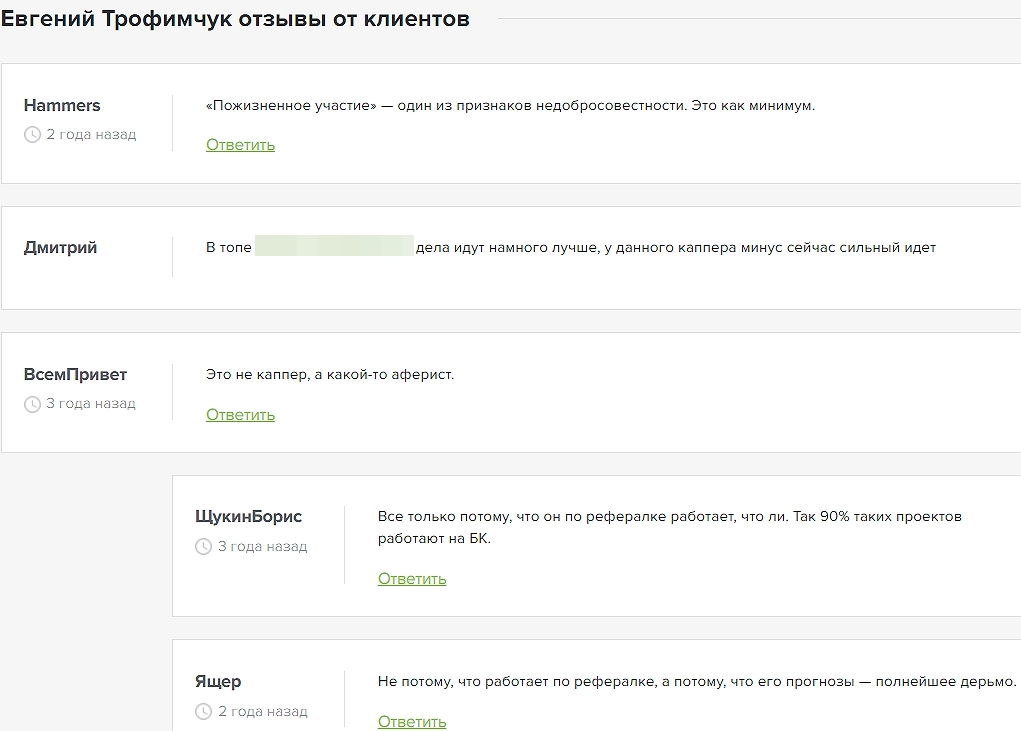 Адекватный игрок не купится на такую просьбу, ведь отправка конфиденциальных данных поможет непонятно кому получить полный расклад по банку и спланировать тактику развода. За долгие годы никто не поднял прибыль с капперами Трофимчуком, Аблямитовым и Владиславом Воробьевым, что хорошо доказывают отзывы на Бестставка Ру.