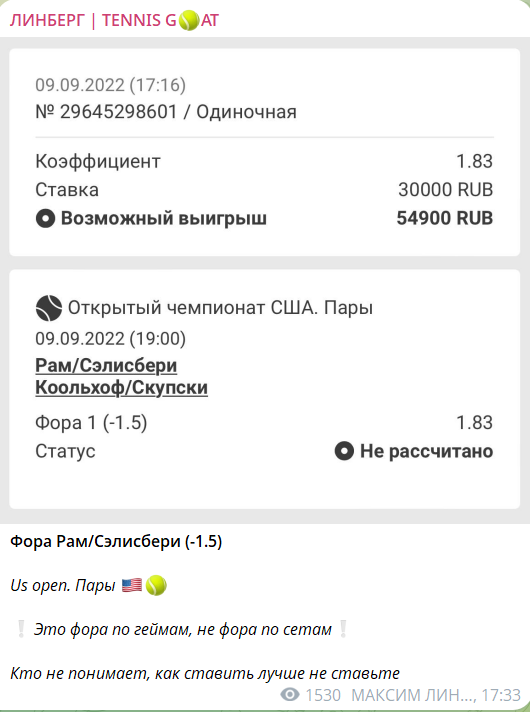 Канал ведет прогнозист Максим Линберг. Его главная услуга – инсайды о договорных матчах в теннисе. Контент в канале делится на: